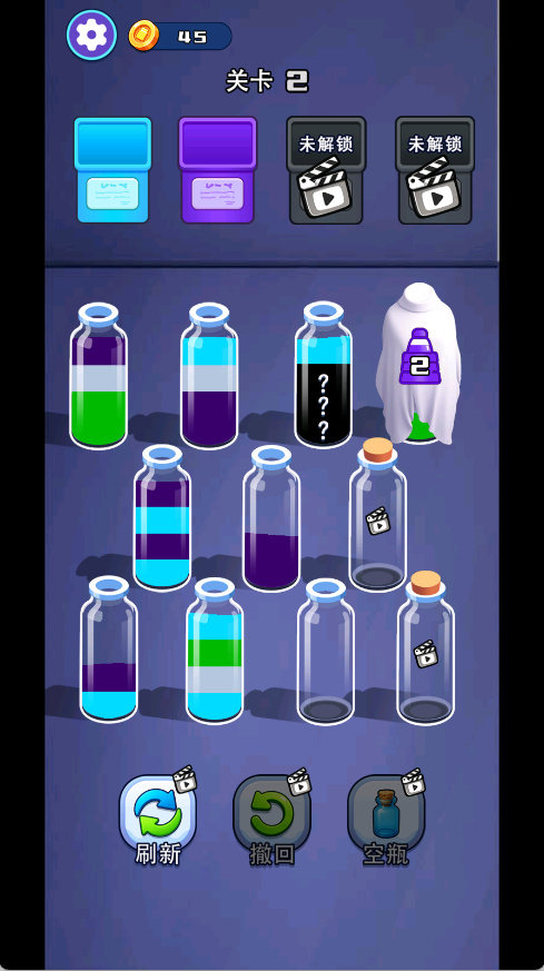 3、后期的关卡还是比较的难的,因为有些水我们是看不见颜色的,我们可以先将看的见的相同的倒在一起。